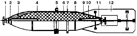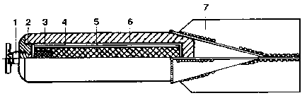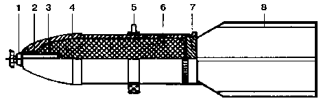бугель; 6 - взрывчатое вещество; 7 - дно; 8- стабилизатор.