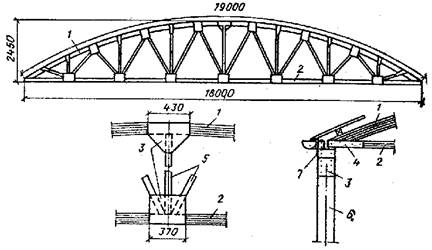 пластинками для скрепления узлов: 1 – гнуто-клееный верхний пояс фермы из пяти