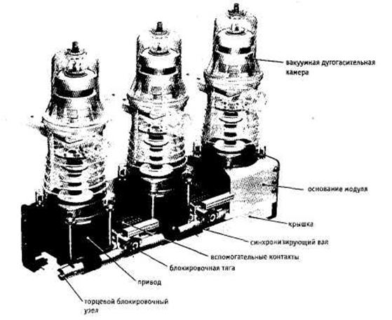 расположены: общиё для трёх полюсов приводной вал с рычагами, отключающие