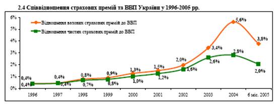 Співвідношення страхових премій та ВВП України у 1996–2005 роках