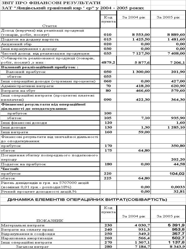 Фінансові результати ВАТ “Янцівський гранітний кар'єр” у