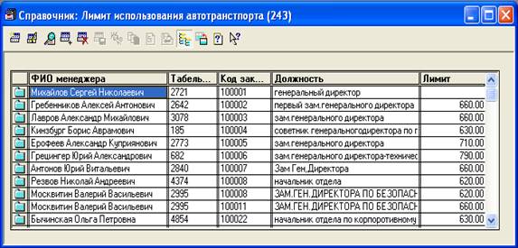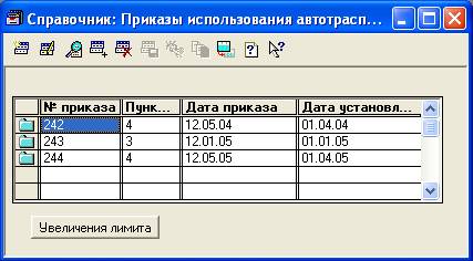“Лимит использования автотранспорта” этот справочник показывает сведения,