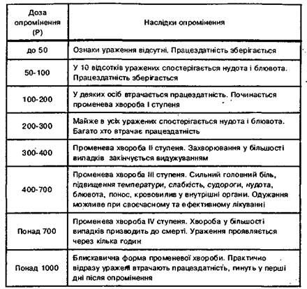 дозою опромінення протягом чотирьох діб у воєнний час є 50 рентгенів. На мирний