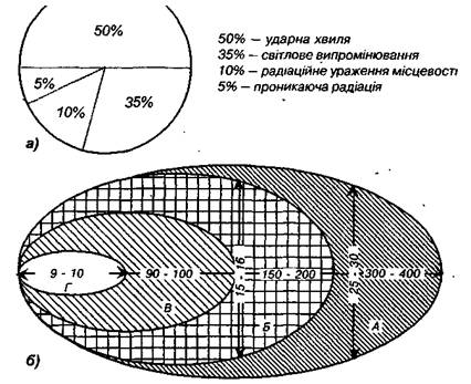 Рис. 1. а) Приблизний розподіл енергії ядерного вибуху по поражаючих