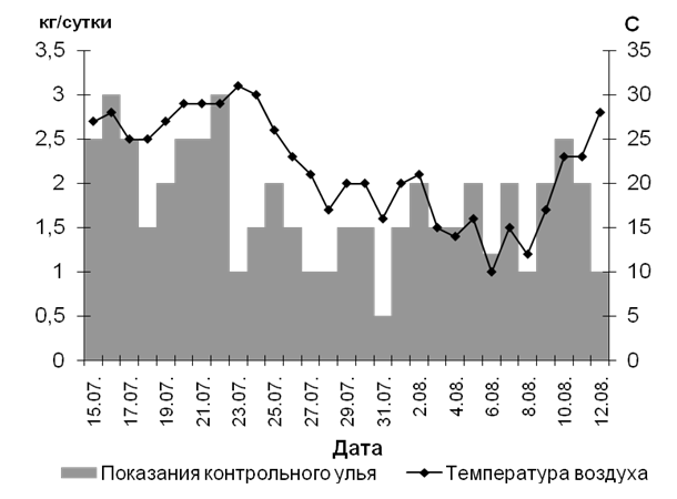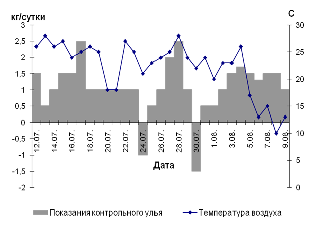 2 – Показатели контрольного улья в зависимости от метеорологических условий за