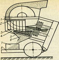 щиток; 5-пазы; 6-отводящий желоб; 7-дополнительный резервуар; 8-сница комбайна.