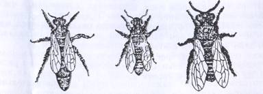 составляющие семью пчел: а- матка; б- рабочая пчела; в- трутень.