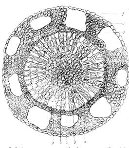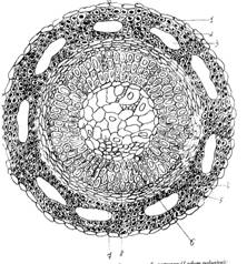 четко выраженные 3 блока: первичная кора, центральный цилиндр и сердцевина;