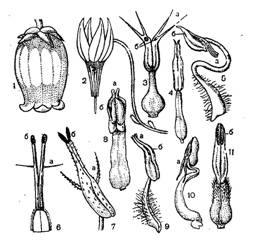 болотная (Chamaedaphne calyculata); 2 – клюква (Oxycoccus) Тычинки: 3 – зеновия припудренная (Zenobia pulverulenta); 4 – хамедафна болотная (Chamaedaphne calyculata); 5 – лиония кустарниковая (Lyonia fruticosa); 6 – черника тычиночная (Vaccinium stamineum); 7 – черника обыкновенная (Vaccinium myrtillis); 8 – эллиотия кистевидная (Elliotia racemosa); 9 – гаультерия лежачая (Gaultheria procumbens); 10 – пиерис пышноцветный (Pieris floribunda); 11 – оксидендрум древовидный (Oxydendrum arboretum): а- тычиночные придатки; б- поры.