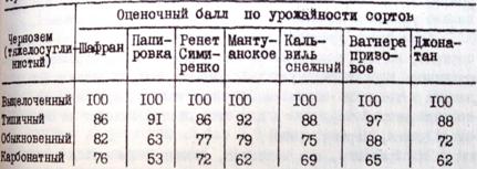 черноземов (табл.9). Из сортов яблони меньше всего снижает урожайность на этих почвах Шафран (76 баллов) и Ренет