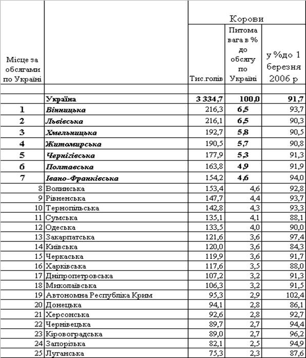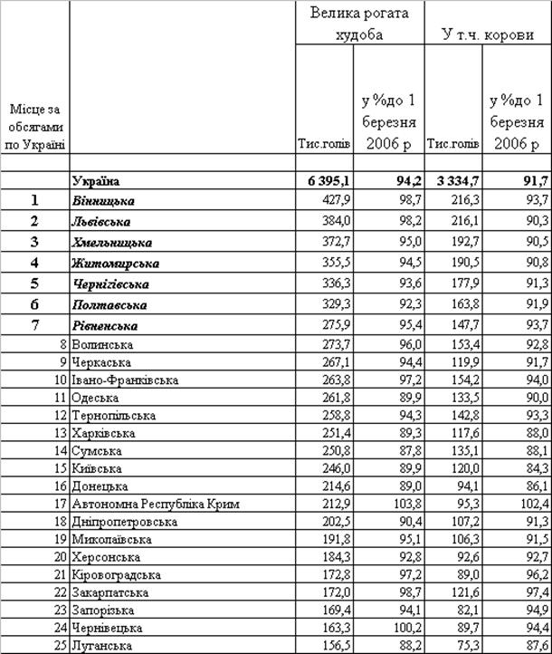 ВРХ(корів) по регіонах станом на 1 березня 2007 року