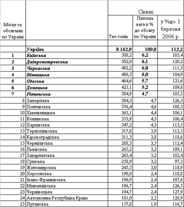 свиней по регіонах станом на 1 березня 2007 року