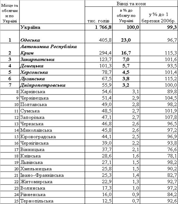 овець та кіз по регіонах станом на 1 березня 2007 року