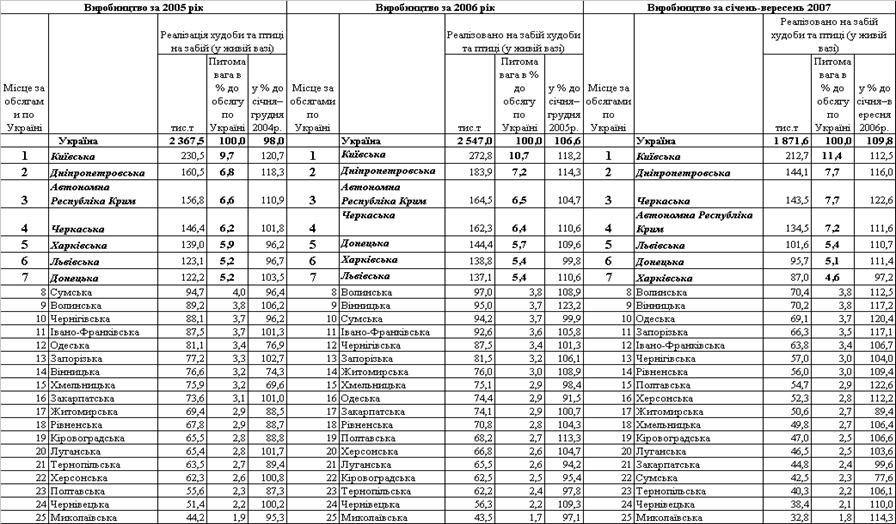 виробництва м’яса по регіонах за 2005 –2007 роки