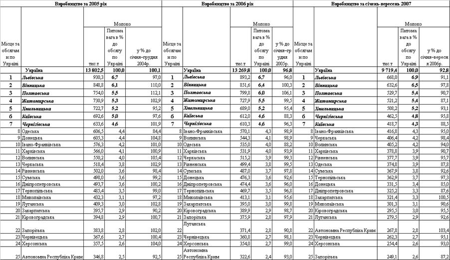 молока по регіонах за 2005 –2007 роки
