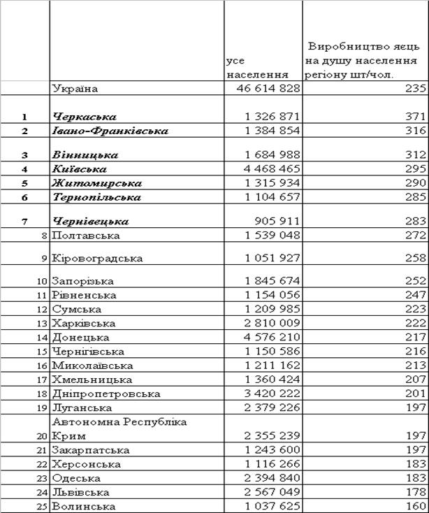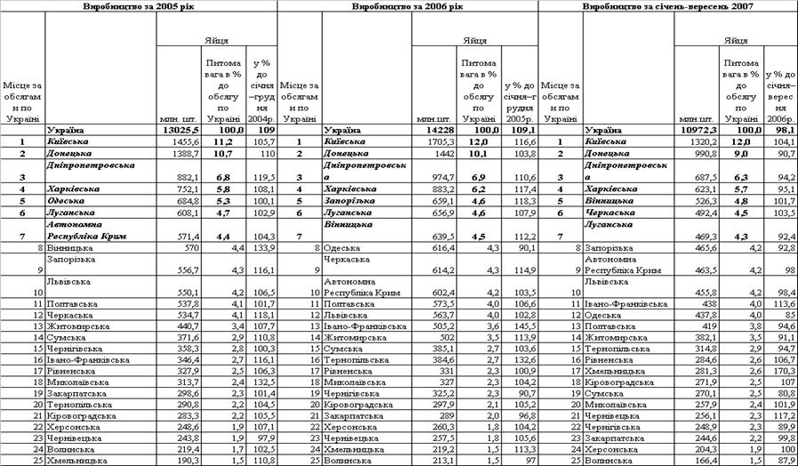виробництва яєць по регіонах за 2005 –2007 роки