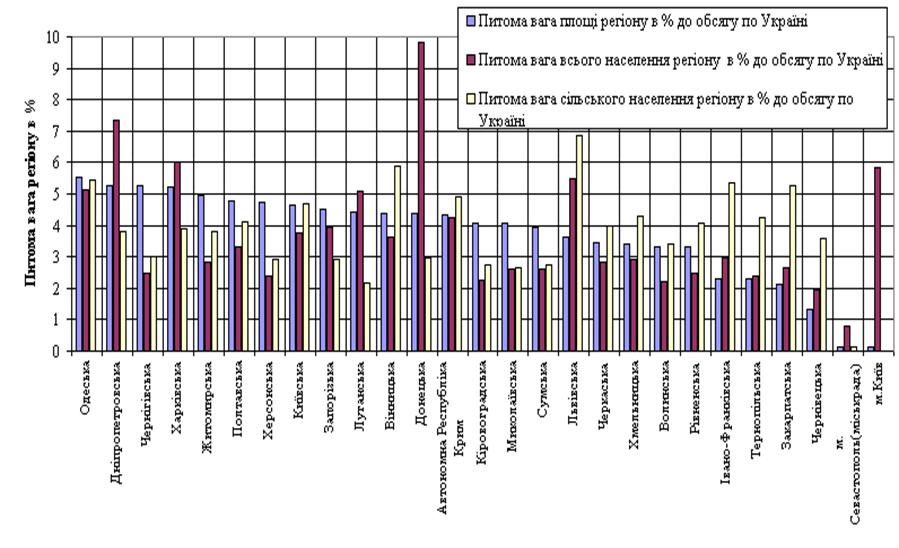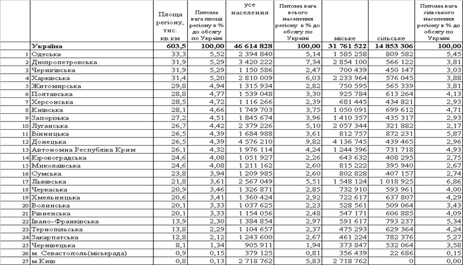 площа, чисельність та структура населення України по регіонах станом на 1