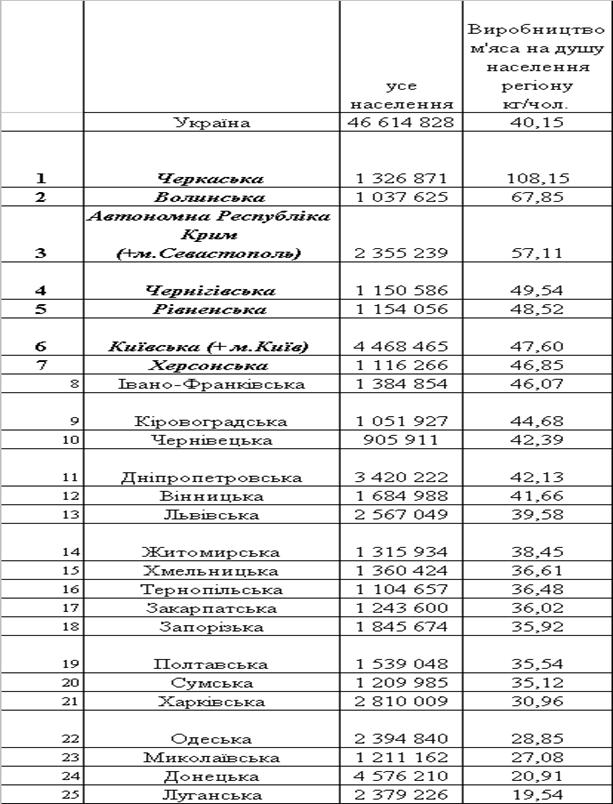 виробництва м’яса на душу населення по регіонах за 2007 рік