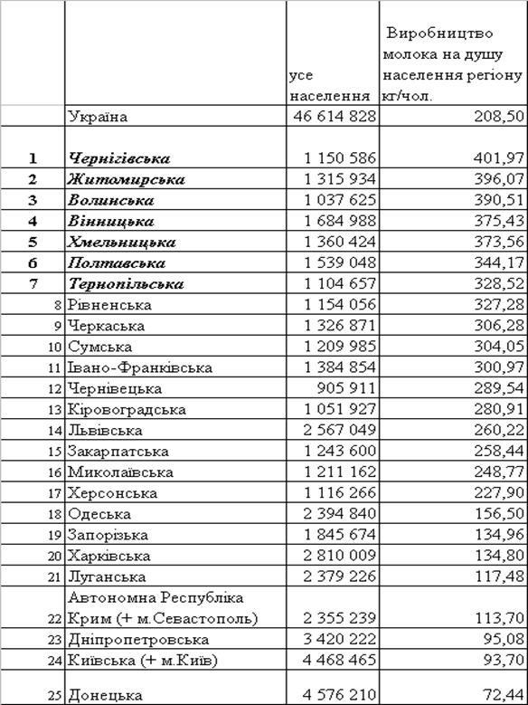 виробництва молока на душу населення по регіонах за 2007 рік