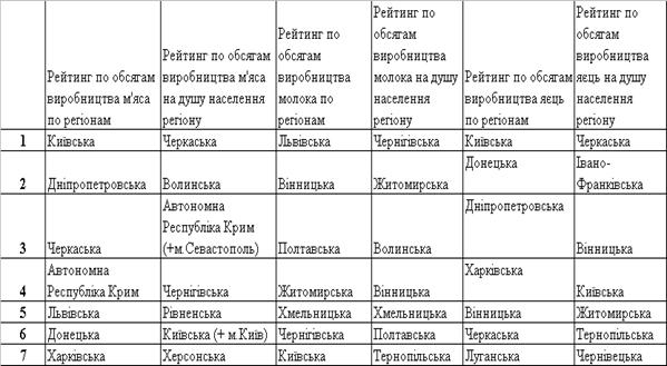 рейтинг виробництва продуктів тваринництва по регіонах за 2007 рік (перші