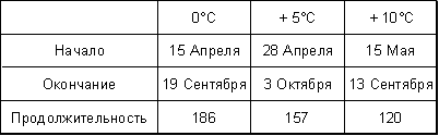 ниже определённых пределов и продолжительность периода с температурой 0°; +5°; 10°C.