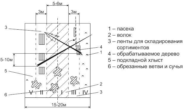работ: валка, обрезка и раскряжовка производится сзади машины на разработанную