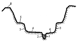 переріз долини: 1 - русло; 2 і 3 - руслові і корінні