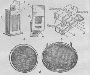 кормушка К. - 4. Надрамочные кормушки: Б - металлическая; В - ящичного типа