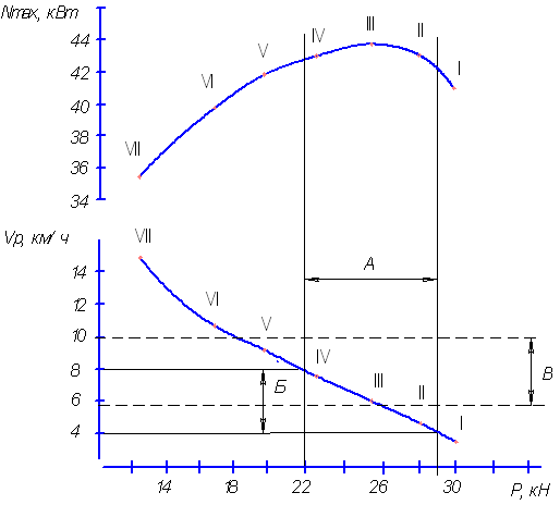 тяги на крюке трактора на выбранной основной передаче, кН;