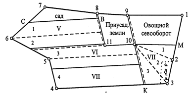 части землепользования — пятипольный овощной севооборот, сад, три поля полевого