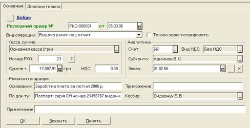 На рис. 6.9 як приклад показаний касовий ордер від 05.03.2006 р. для видачі зарплати за