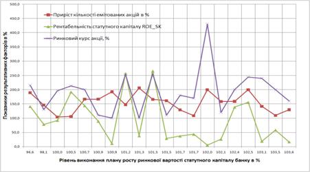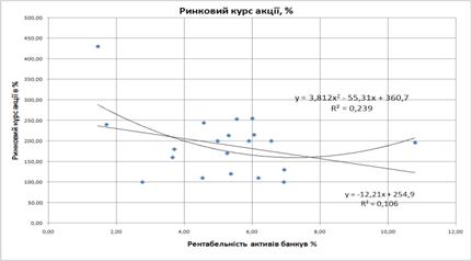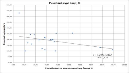 розподілу банків за рентабельністю статутного капіталу банку та ринковим курсом